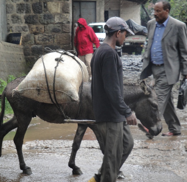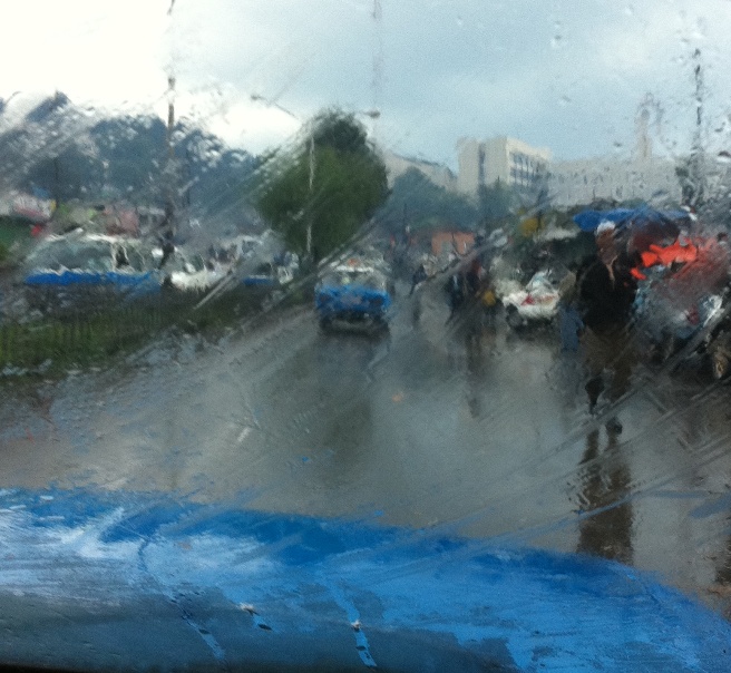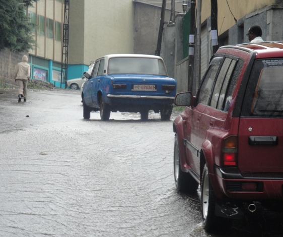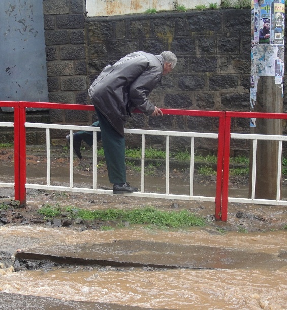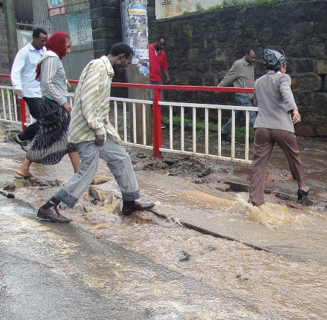 It was a rainy season that run for months and months. The Kremt of 2010 (2002 E.C) may be remembered as one of the wettest and longest on record. It started raining as last March and Addis hasn't seen a week without a rain since then. It is now early October and the rains have finally decided to call it quits. This edition of MediaETHIOPIA's Photo Essay brings you pictures from one such rainy day of this season. It was actually in Pagumey - just few days shy of the Ethiopian New Year. First Row, Left to right: Traffic on Churchill Road, an ancient Lada negotiating the hill on the way to the Russian Cultural Center near Cathedral Catholic School, Muncipality Building seen through the foggy wind screens of a Lada taxi. This grainy image of Addis Ababa punctuated with the bright blue colors of the city's taxies is what lingers in the minds of any Addis Ababan. Second Row, Left to right: Negotiating the mini floods that routinely clean up Addis streets. Third Row, Left to right: An old man performs 'let us cross the metal bars' exercise that is so common in Addis including the Ring Road. Even the 'dof' of that day could not clear the smog from the poison-spewing trucks and cars that are destrying our cities and our lungs.